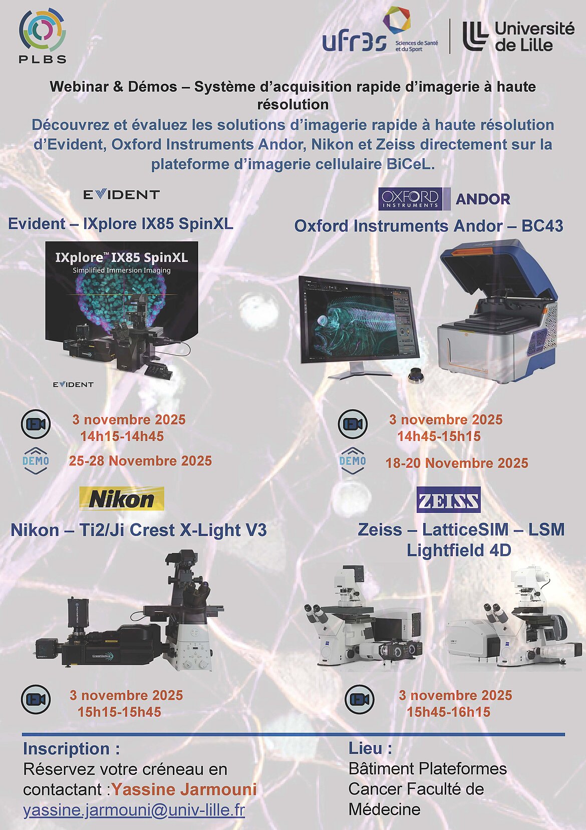 Découvrez et évaluez les solutions d’imagerie rapide à haute résolution d’Evident, Oxford Instruments Andor, Nikon et Zeiss directement sur la plateforme d’imagerie cellulaire BiCeL.