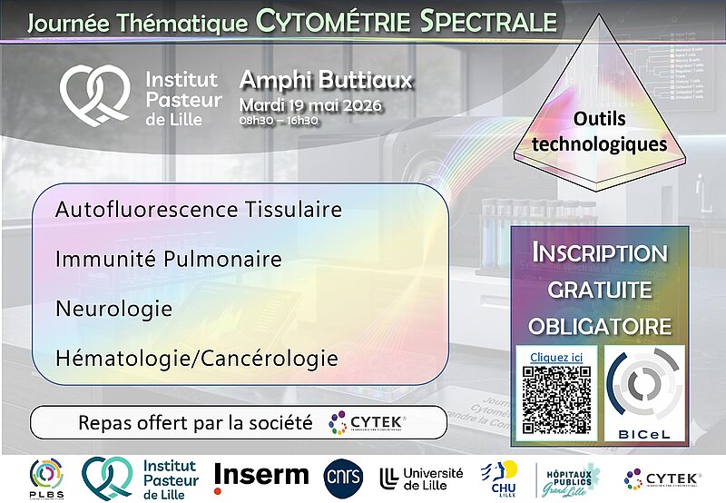 The BioImaging Center Lille (BICeL) platform of US41/UAR2014/PLBS is organizing a scientific and technological day on the theme “Spectral Cytometry” at the Buttiaux Amphitheater, Institut Pasteur de Lille, on Tuesday, May 19, 2026.